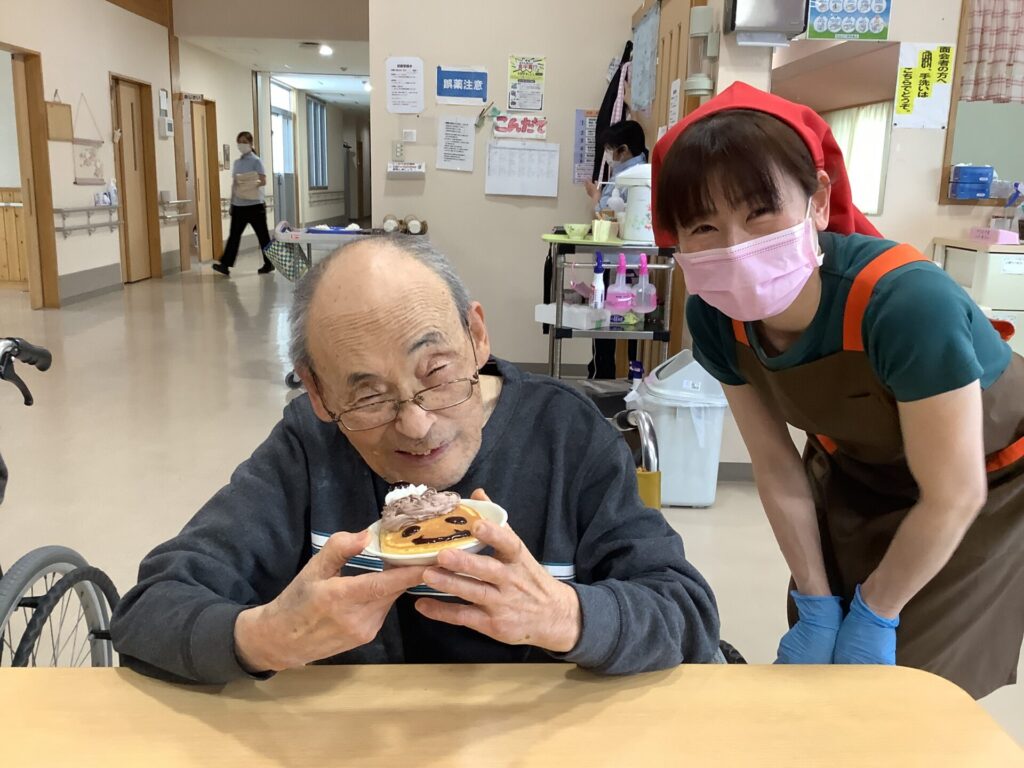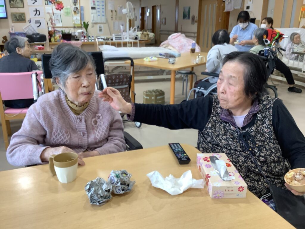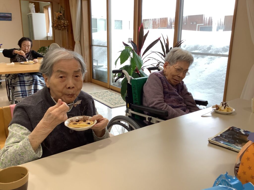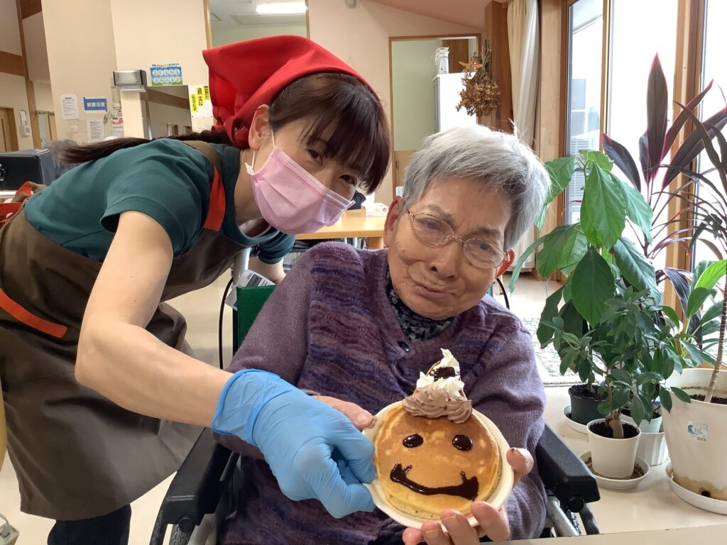 鬼をイメージしたホットケーキを食べたり、ユニットにやってきた鬼を豆まきで追い払いました。