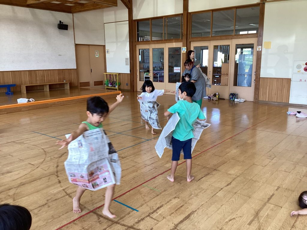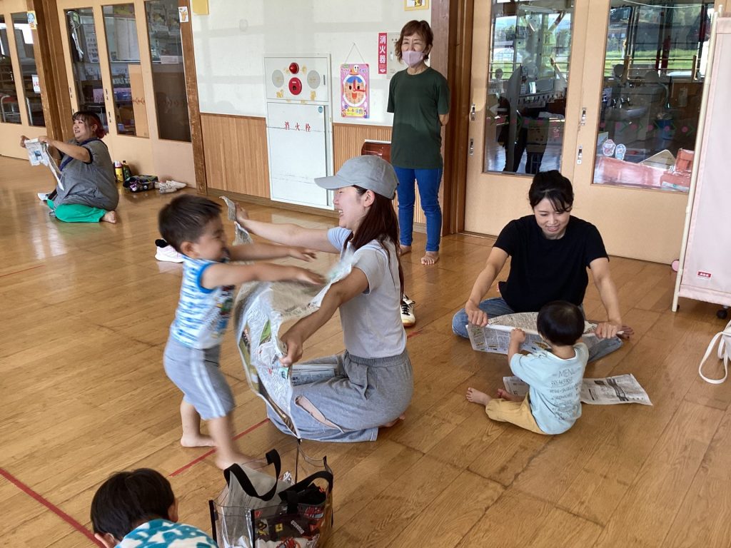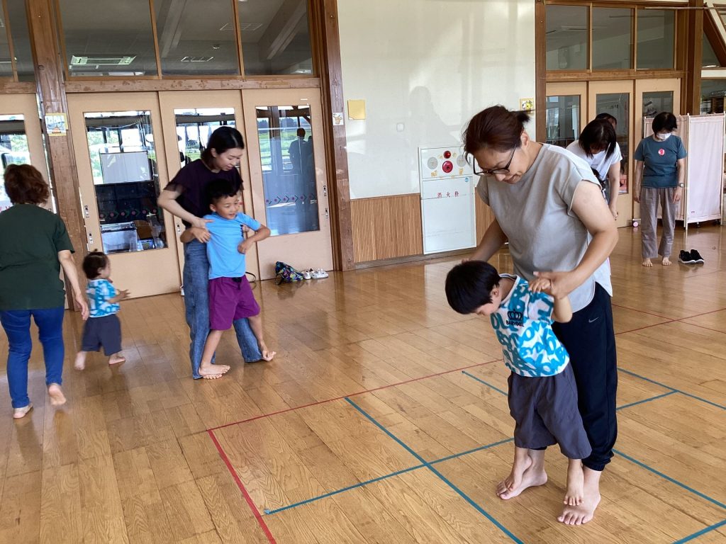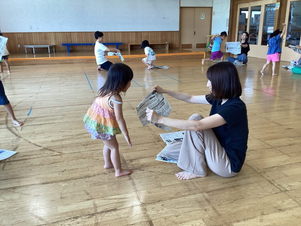 0~5歳児12組の親子が参加しました。お家の方の足の上や背中の上に立ったり、新聞紙を使っての遊びも各年齢なりに楽しみ、みんなとってもいい表情で触れ合っていました♪