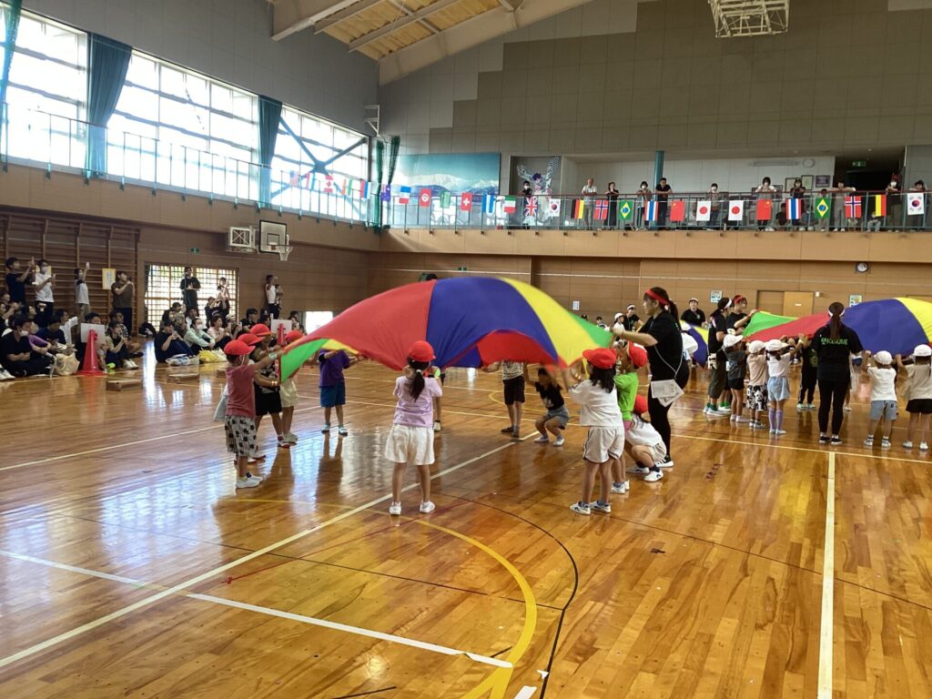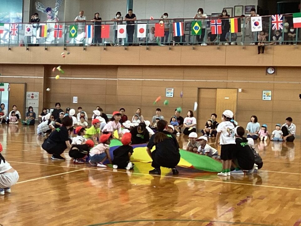 オープニングでは4歳児(ひまわりぐみ)と5歳児(さくらぐみ)が友達と一緒に息を合わせて「バルーン」に挑戦!バルーンの最後には色とりどりの野菜達が勢いよく高く飛び上がりました。
