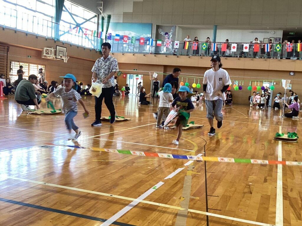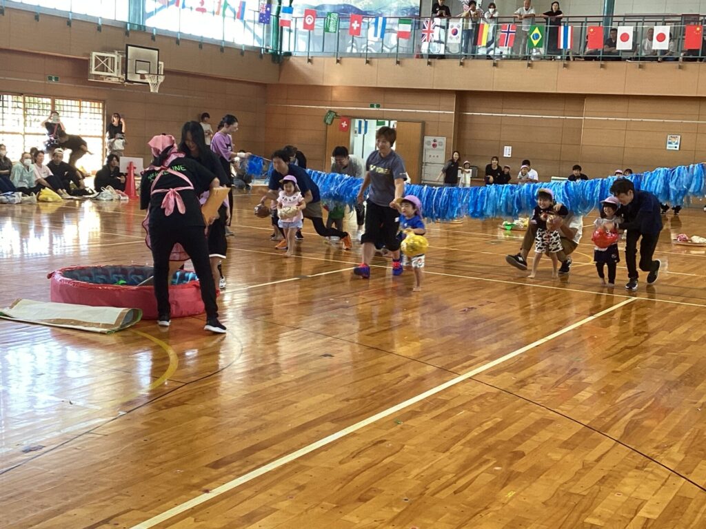 3歳児(ばらぐみ)は親子で『やさいさーん、とれましたよー!』の競技を楽しみました。お家の人に抱っこしてもらってカラフル風船トマトを収穫♪最後は収穫した野菜を持って、元気いっぱいゴールを目指して走りました!