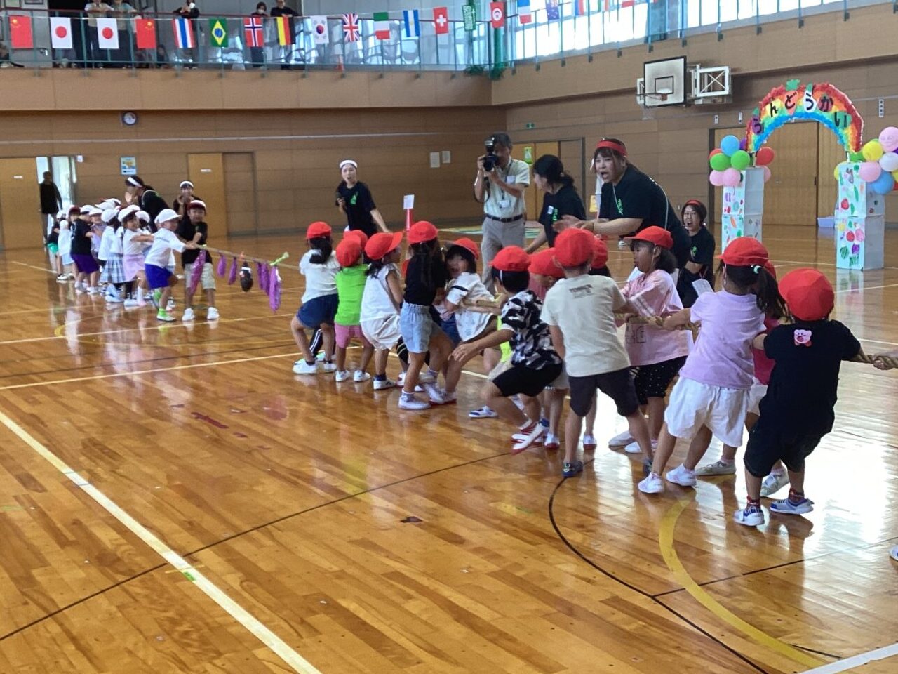 4歳児(ひまわりぐみ)と5歳児(さくらぐみ)は親子競技の他に綱引き「いもほりつなひき どっこいしょ!」も行いました。「オーエス!!オーエス!!と力いっぱい綱を引っ張って頑張りました。