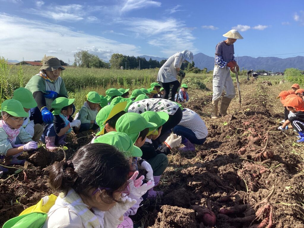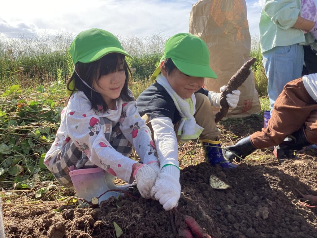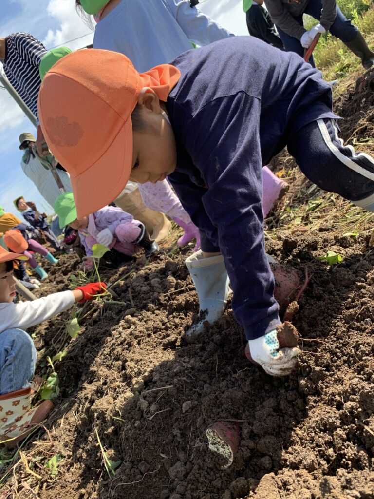 地域の方のご協力のもと、今年も大きくたくさん実ったさつまいもを見つけるたびに「みて!みて!おっきい~」「さつまのおいもさんいたよ~」「ここにもあるかも♪掘ってみよう!」と嬉しそうに友達と声を掛け合い、力を合わせて掘っている様子も見られました。収穫したさつまいもを手に持ちながら「はやく食べた~い♪」という声も聞かれましたよ。焼き芋、スィートポテト、芋煮…どんな風においしく食べようか今から楽しみにしている子ども達です。
